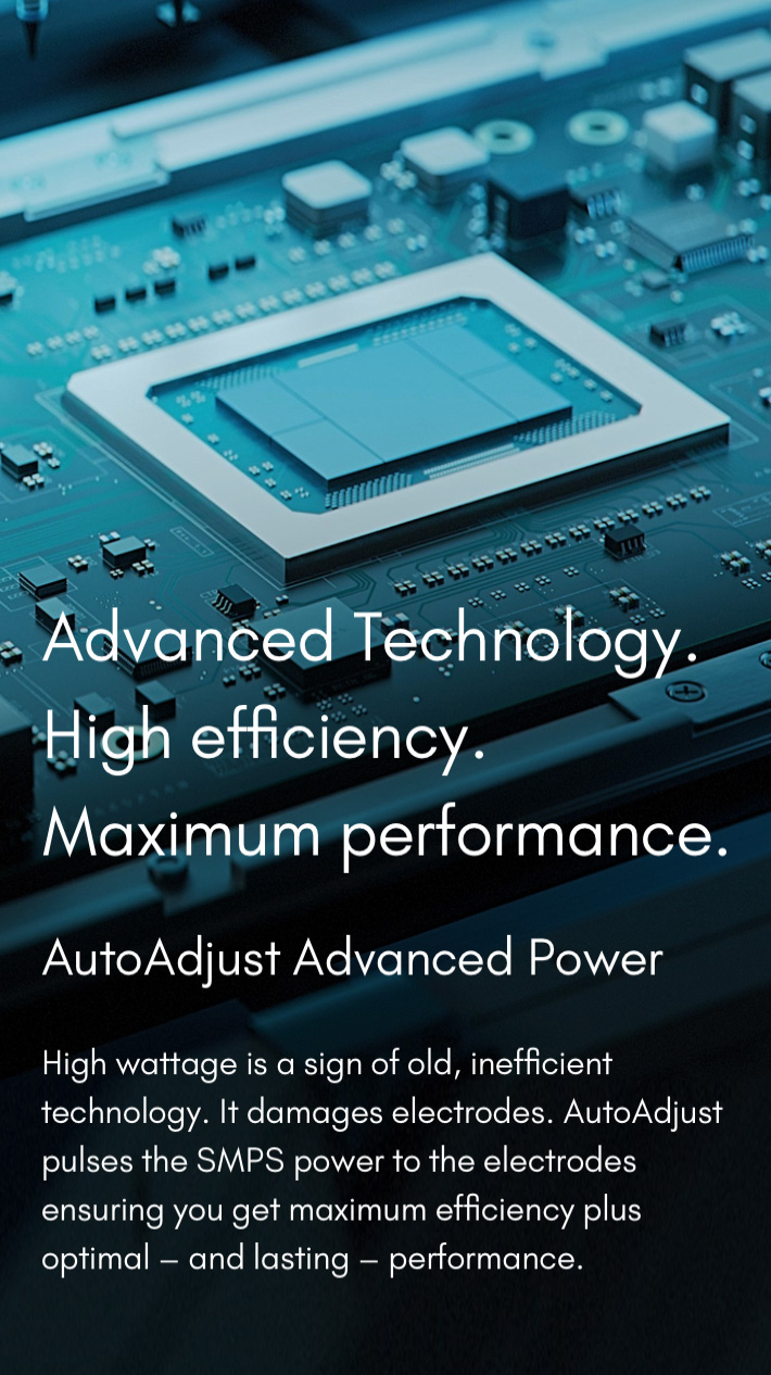High wattage is a sign of old, inefficient technology. It damages electrodes. AutoAdjust