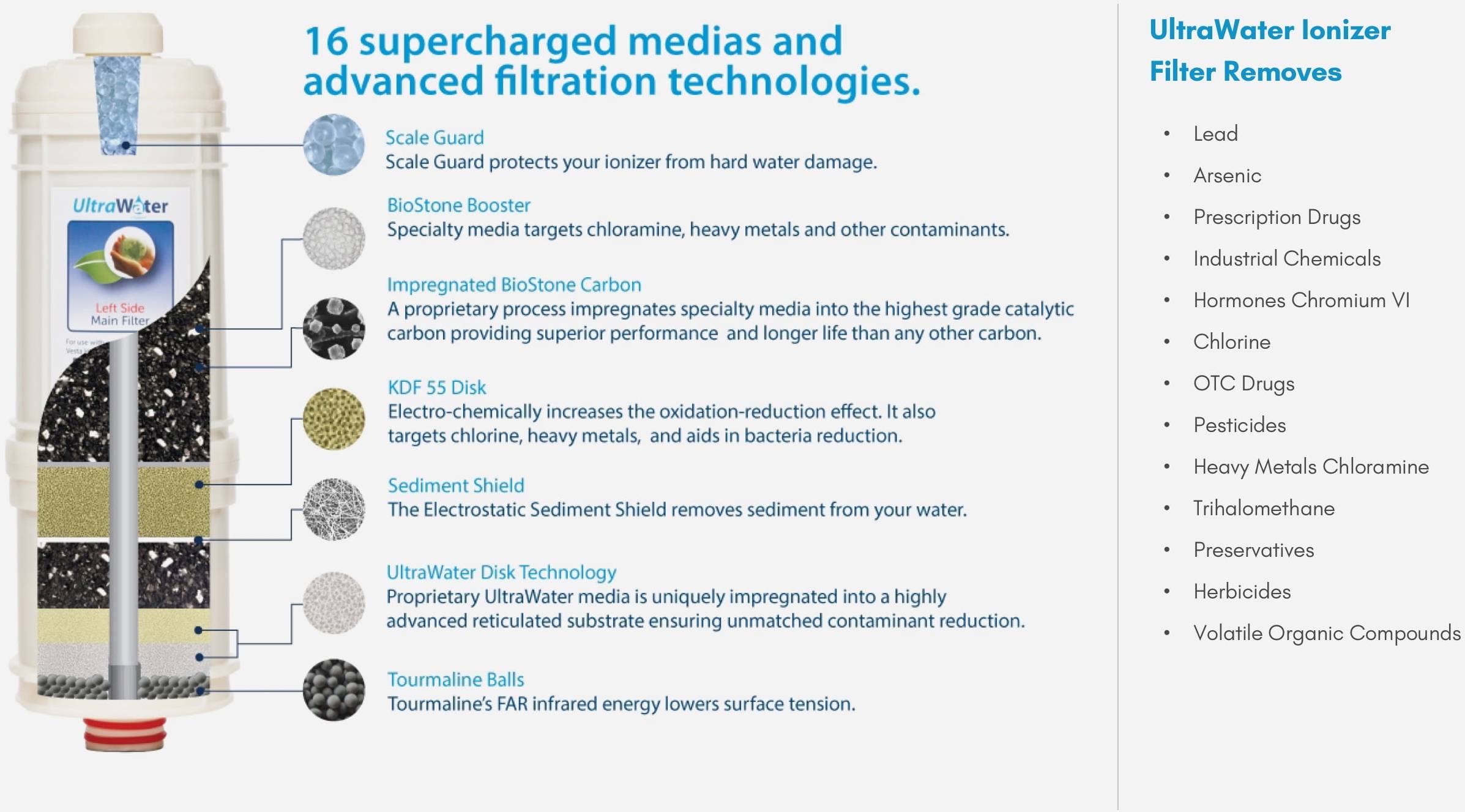 What good is healthy water if it isn’t also clean water? To that end, be thorough in your research. Watch out for slick marketing. One company offers “customized filtration”. All they really do is give you a standard (and unsightly) three-filter array (installed separate from your ionizer) regardless of where you live. You end up with the extra hassle and cost of five filters and external housings to change annually. If you don’t, you void your warranty. Another company touts .01 micron as its “UltraPlus”, best solution. A .01 micron filter sounds good, and can remove microbes, but is lousy at broad contaminant removal. We have sold them for 15 years and only recommend them if you are on untreated well water. Read on and you’ll learn about our UltraWater technology—the most thoroughly tested and safest option available.